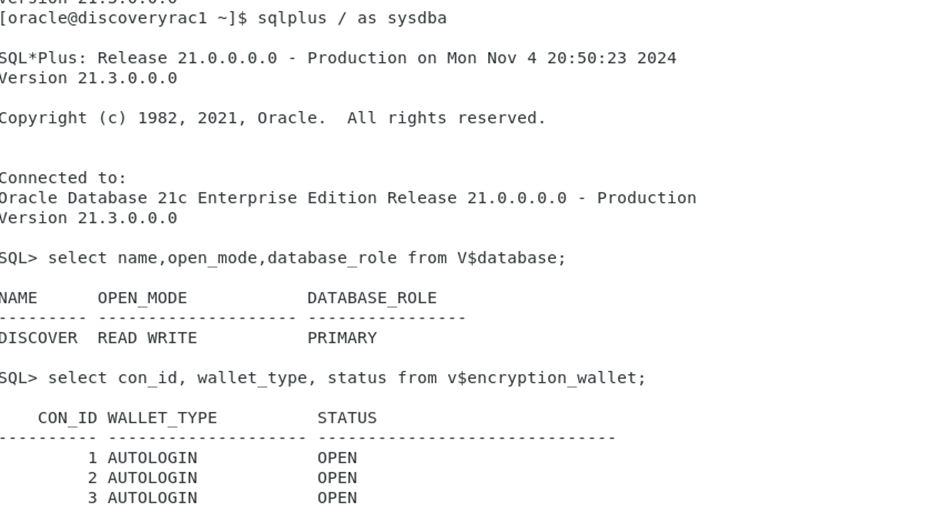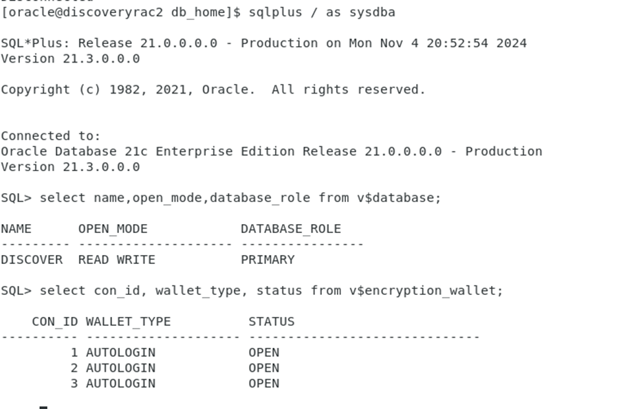 [oracle@discoveryrac1 tde]$ scp ewallet_2024110317141637.p12 ewallet.p12 cwallet.sso oracle@discoveryrac2:/u02/app/oracle/admin/wallet/tde/