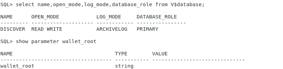 SQL> ADMINISTER KEY MANAGEMENT CREATE AUTO_LOGIN KEYSTORE FROM KEYSTORE IDENTIFIED BY discovery;
