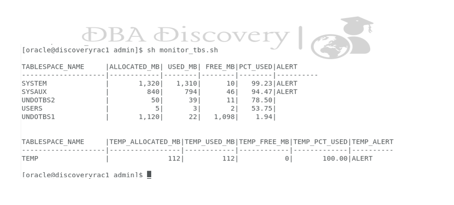 • Permanent Tablespaces: The script retrieves tablespace name, allocated space, used space, free space, and usage percentage. If a tablespace’s usage exceeds 90%, an “ALERT” appears in the output.